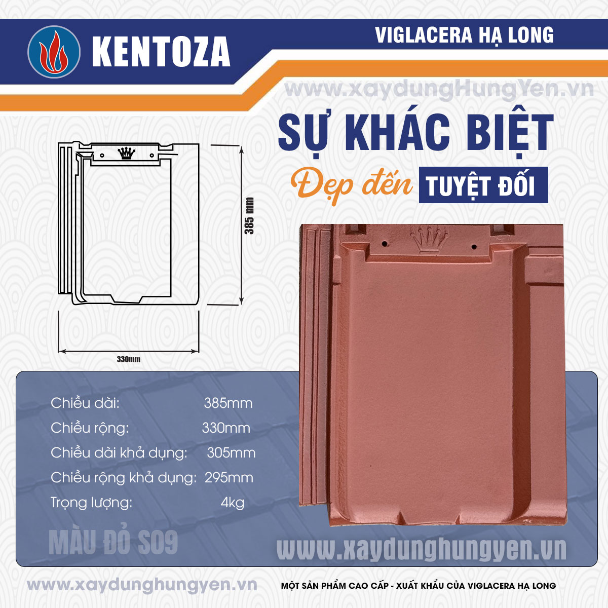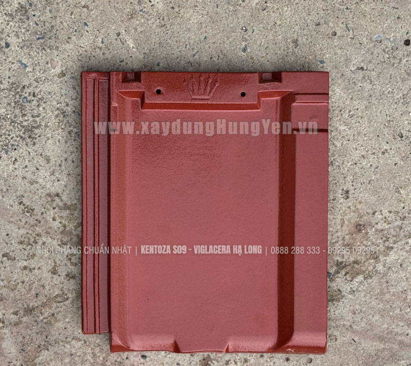 Ngói phẳng Kentoza S09 - đỏ – Viglacera Hạ Long là dòng ngói phẳng tráng men và phụ kiện cao cấp được sản xuất tại nhà máy Viglacera Hạ Long, ứng dụng công nghệ tiên tiến hàng đầu thế giới. Đây là sản phẩm ngói xuất khẩu cao cấp, được nhập đồng bộ và phân phối độc quyền tại Hưng Yên bởi Công ty TNHH Đức Thắng.