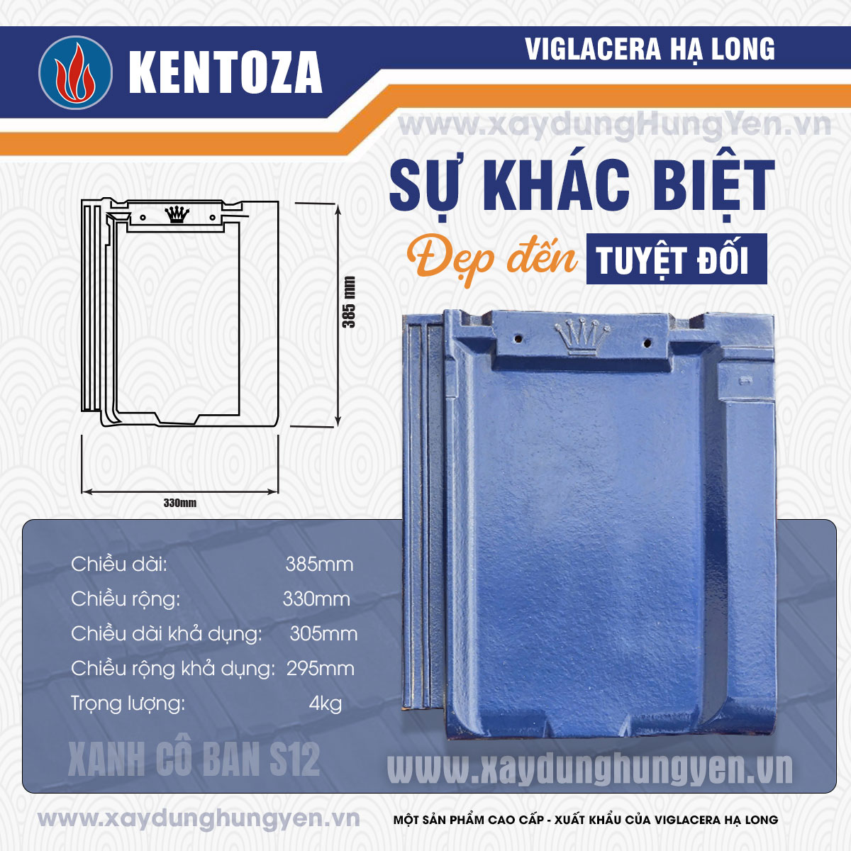 Ngói phẳng Kentoza S12 - xanh cô ban – Viglacera Hạ Long là dòng ngói phẳng tráng men và phụ kiện cao cấp được sản xuất tại nhà máy Viglacera Hạ Long, ứng dụng công nghệ tiên tiến hàng đầu thế giới. Đây là sản phẩm ngói xuất khẩu cao cấp, được nhập đồng bộ và phân phối độc quyền tại Hưng Yên bởi Công ty TNHH Đức Thắng.